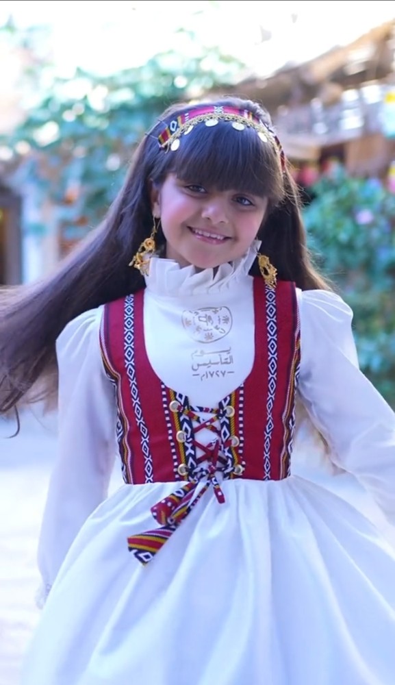 فستان بناتي يوم التأسيس بالون الابيض مع سدو تصميم عصري